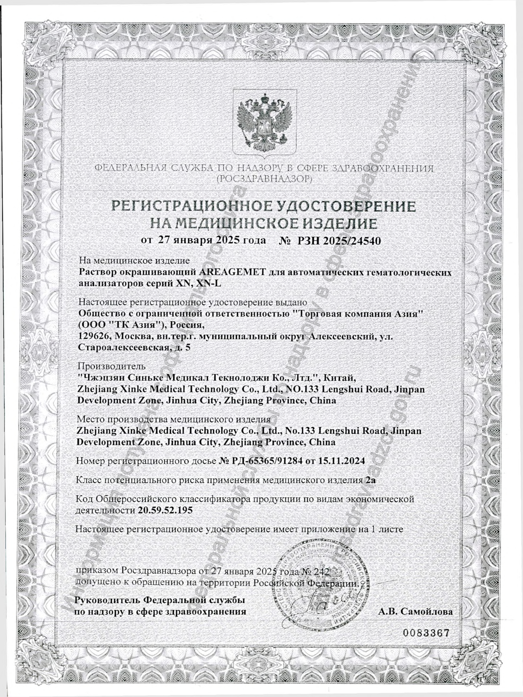 Регистрационное удостоверение к растворам окрашивающим марки AREAGEMET